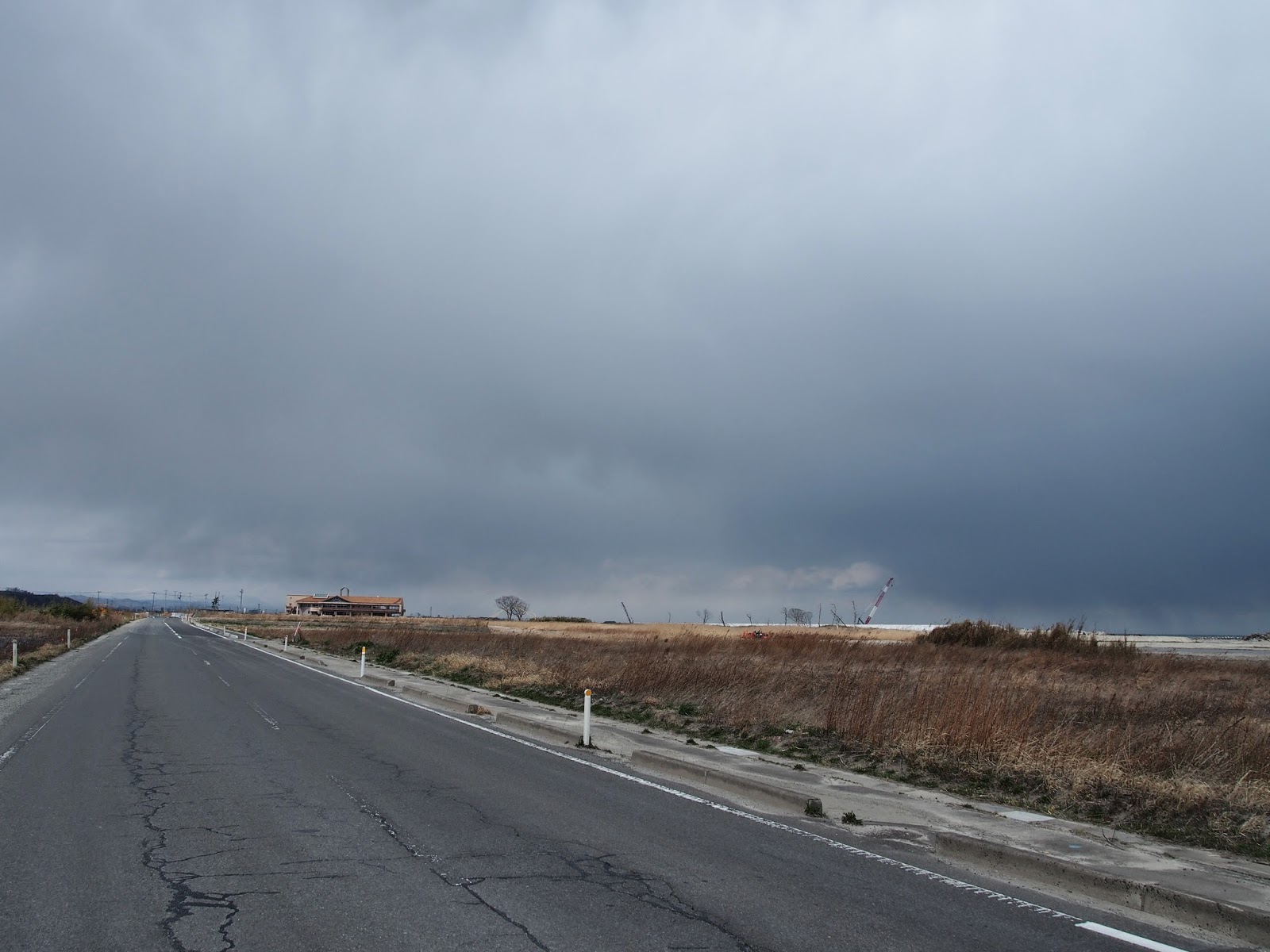 はぬけした松林と水たまりが広がる寒々しい光景が続きます。県境から15kmほど進んだところで、亘理町に入りました。